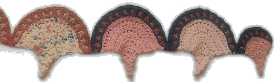 Another note about the half end shells is that they appear smaller than the whole shells. This pattern (and I have tried several versions) seemed to be the one that straightened out the sides of the afghan the best. When you sew them into the afghan, there is no need to see to it that it fits in like a clam. You just sew it wherever it falls naturally. The border may appear to protrude slightly, but that will straighten out when it is stitched to the next row. | ||