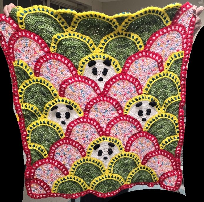| I used black cotton yarn for the Panda face parts. They were sewn on using an embroidery needle and a thinner white cotton yarn, catching the stitches toward the back of the piece so they do not show. They can be stitched onto the clamshell either before or after the clamshell is stitched onto the afghan. It is a little easier to stitch the faces on the shell before attaching the shell, but there is a light chance that the face will appear tilted. The surest way to get the face on the way you want it is to sew it on a clamshell that has been attached to a single row of clamshells, before sewing the row onto the afghan. |